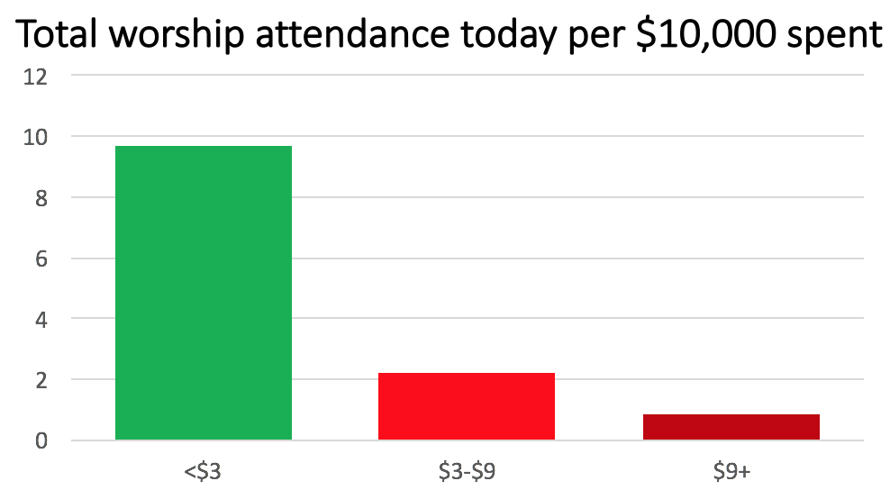 What if we asked only two questions for supporting new faith communities: (1) Is it an initiative coming out of a strong founding church? (2) Can we support it with proportionate denominational funding? In this case, I’ve identified proportionate as matching funding from the denomination that would put a church in that <$3 category above.