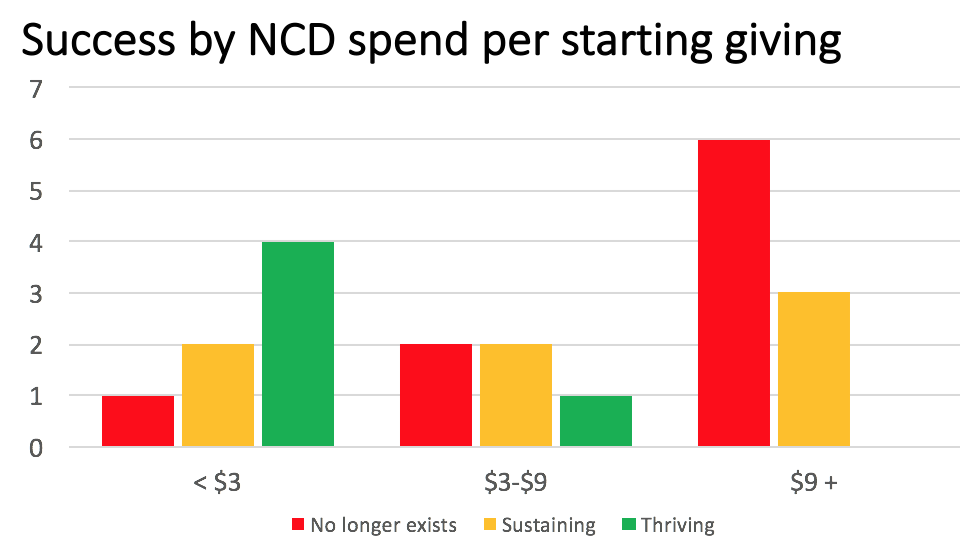 We categorized them into churches that received <$3 in total from the denomination for every dollar contributed by members in the first year (e.g. If a new church’s giving was $50,000 in its first year, the total denominational support was $150,000 or less), churches that received $3 – $9 for every dollar contributed by members, and those that received over $9. Look at the success rates: