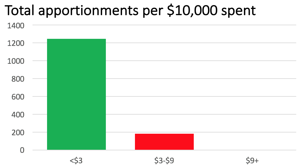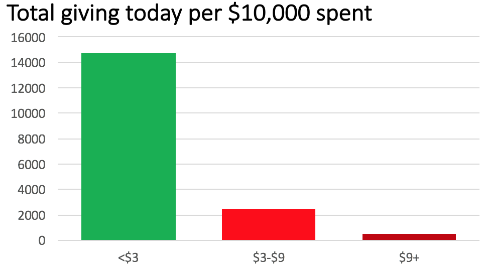 To help make sense of this chart –– The churches that received a total of <$3 from the denomination for every dollar of first-year giving are averaging nearly ten people in worship per $10,000 invested by the denomination. If the UMC invested $100,000 in one of these churches, attendance today is likely around 100 today. By comparison, if the UMC invested $100,000 in a more disproportionate way –– if it was in the middle category, that church is likely to have 20 in worship today.