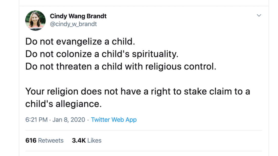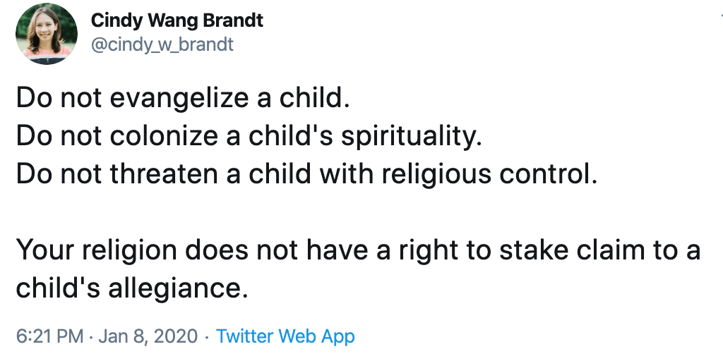 Cindy Wang Brandt wouldn’t like this. And some parenting philosophies today would reject this idea, as well. Parents talk about raising their children to “decide for themselves” when it comes to faith. Parents don’t want to force their faith on their children. And when it comes to those outside our own families, we claim even less right. Who are we to tell others how to live? And so we choose not to meddle, to “live and let live” or “think and let think.” We may have chosen to follow the God of Christianity, but that was a personal decision, one we shouldn’t expect of others.