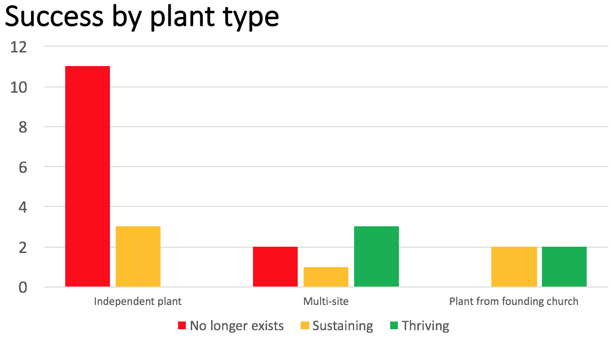 Out of ten attempts at local-initiative plants––multi-sites or plants from a founding church––two no longer exist, three are sustaining, and five are thriving. That makes for an 80% success rate for at least sustaining, 50% success rate for thriving. The two that no longer exist represent one idea that received limited funding and never actually began and one congregation that left the UMC denomination (so they do still exist, just not in the UMC).[note]I’m not including other kinds of plants that were a part of the larger study––multi-language plants (new language, same location), church restarts, and church-within-a-church. Our sample size was too small and results too inconclusive to be of much help. The early results from all of those did not look good.[/note]