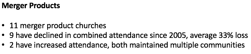 When we look at our merger products, we see more evidence that our bigger is better thinking is flawed. Analysis of Kentucky’s merger product churches over the past decade shows them as the single worst-performing category of churches we found. We had eleven merger product churches. Nine declined in their combined attendance and averaged a 33% loss. Five of them were among our top 20 attendance decreases across the conference during this period. (A category of churches that makes up only 1.4% of the Conference represented 25% of our churches with worst worship attendance losses.)